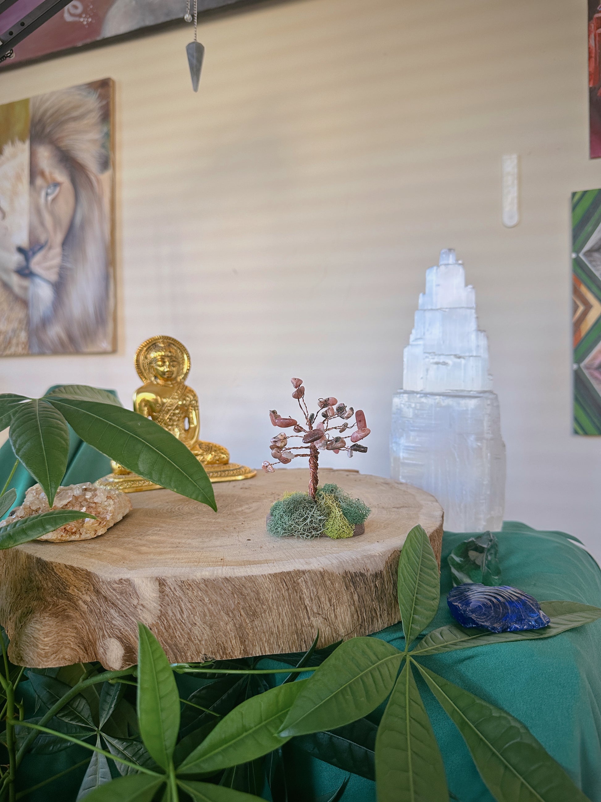 Copper wire wrapped tree made with Rhodochrosite gemstones in the form of the beautiful Maple. This gemstone is known to bring in the energy of love, romance and passion. The base is adorned with dyed moss to give the look of natural land cover.