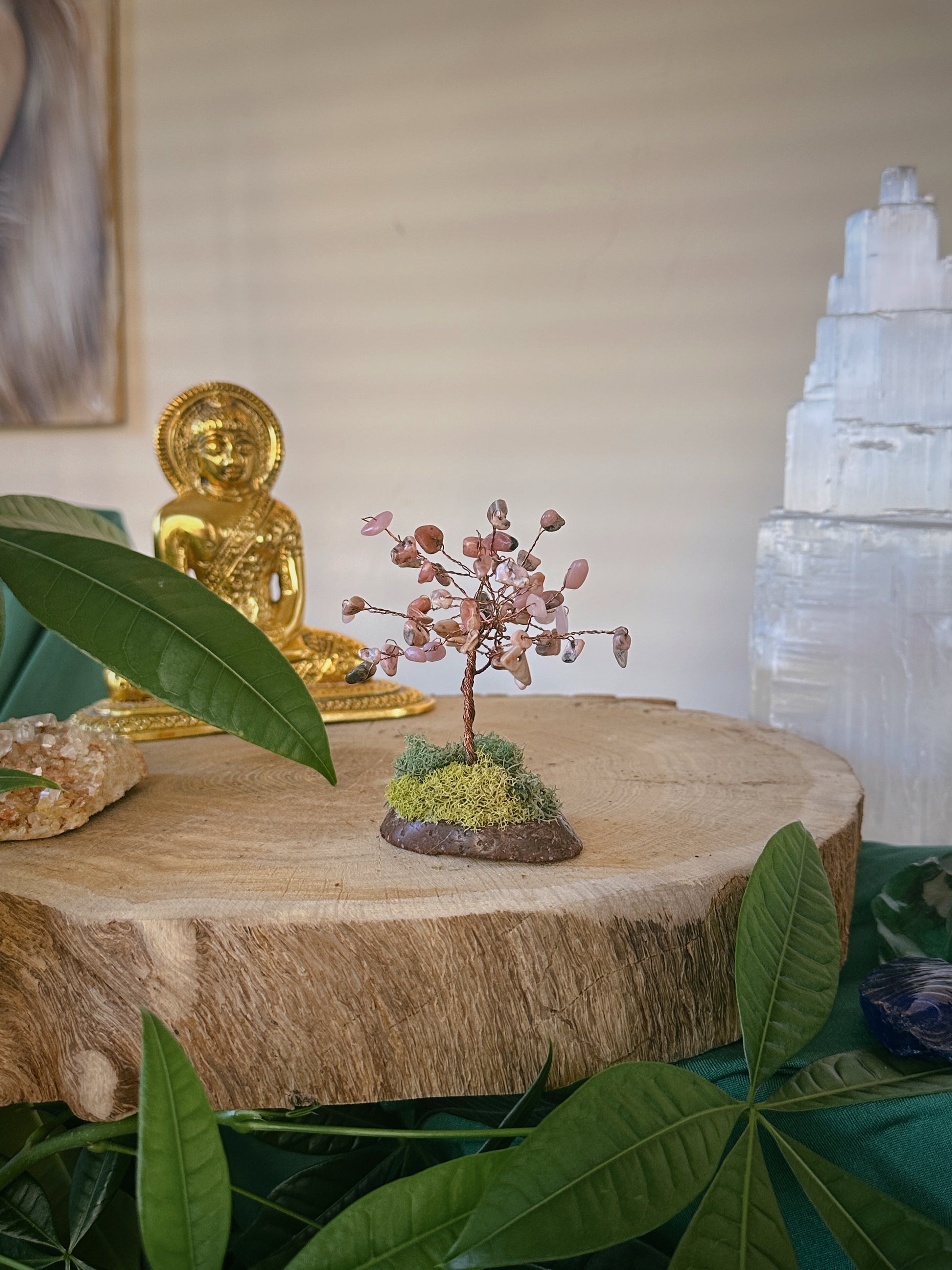 Copper wire wrapped tree made with Rhodochrosite gemstones in the form of the beautiful Maple. This gemstone is known to bring in the energy of love, romance and passion. The base is adorned with dyed moss to give the look of natural land cover.