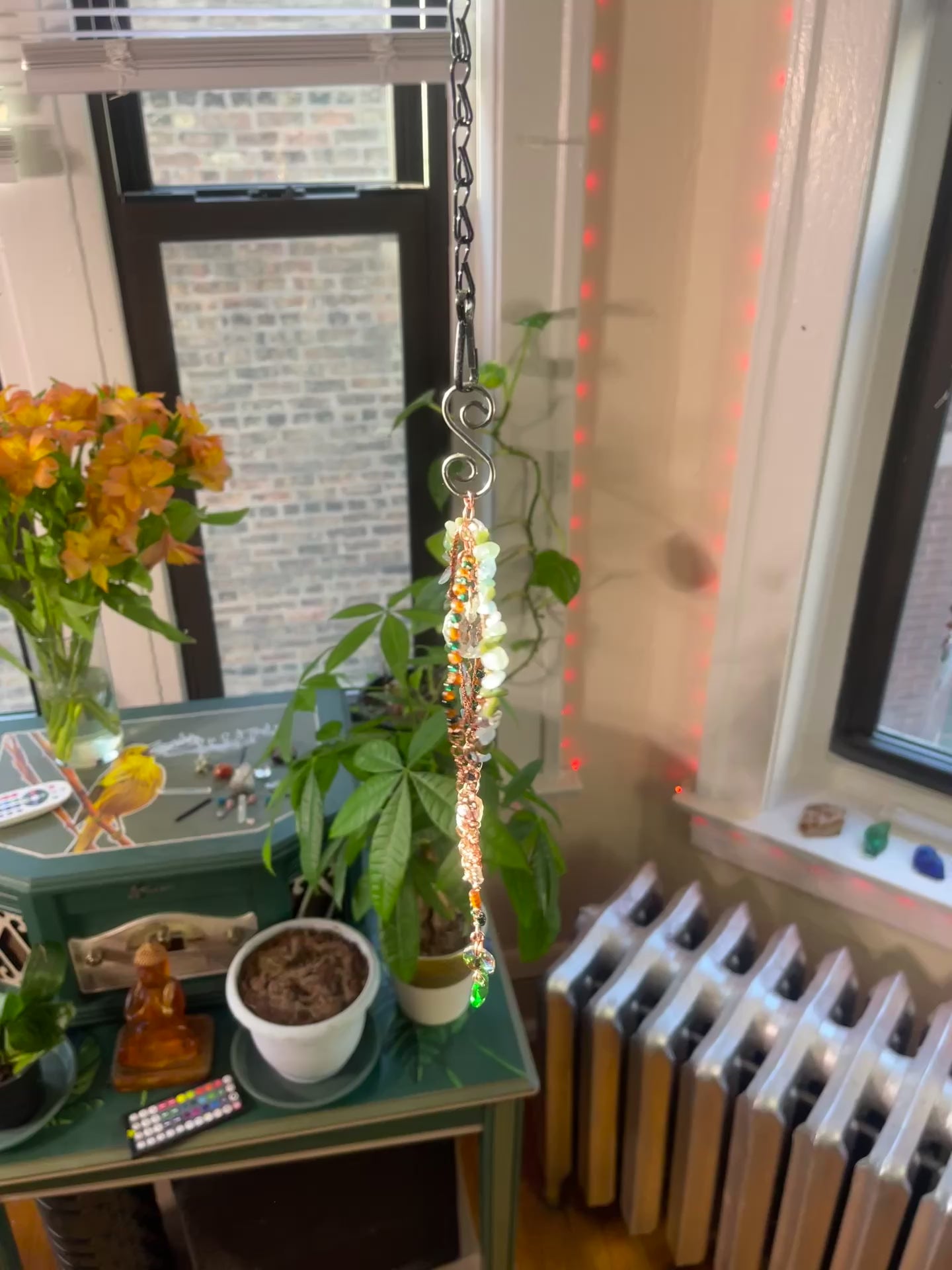 All created by hand, all the chain work, wire and beading work. I exclusively use copper wire as it brings healing and amplifying energy into the space.